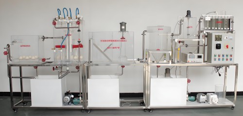 搅拌配水箱、格栅、旋流沉砂池、初沉池、电解槽、絮凝反应斜板沉淀池、小型生化池、中型生化池、好氧生物反应器、二沉池、生化池配水箱、小型进水泵、回流泵、充氧泵、直流调节电源、流量计、帘式膜组件、陶瓷曝气器、调速电机、可控硅无级调速器 、电控箱、时间控制器、实验台架、管道阀门。